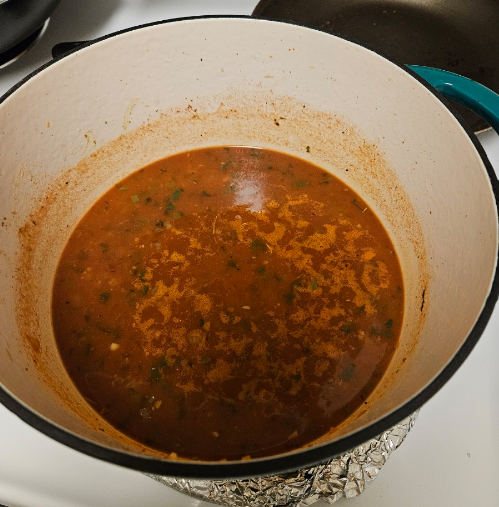 - 소프리토에 토마토 소스와 물을 넣고 잘 섞어준다.
