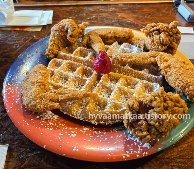 튀긴 치킨과 와플에 시럽과 슈가파우더를 뿌려서 먹는 음식이다. 솔직히 한국인의 눈으로는 아침메뉴로 이런 걸 먹는다고...? 싶겠지만 혈관을 조지는 단짠단짠의 조화가 꽤나 맛있는 편이다.